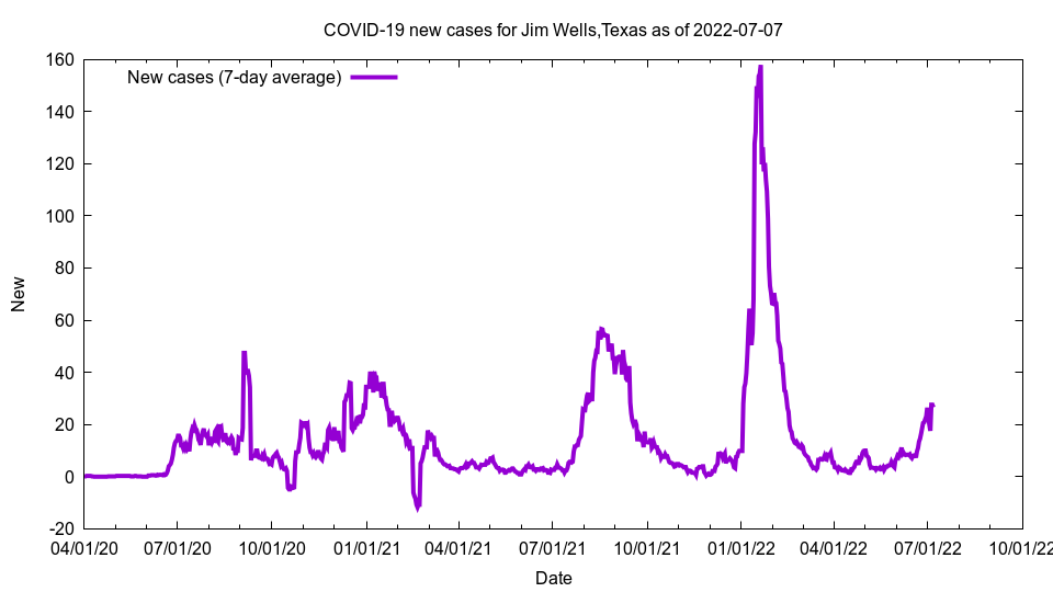 This image shows new cases for Jim Wells, Texas as of 2022-07-07