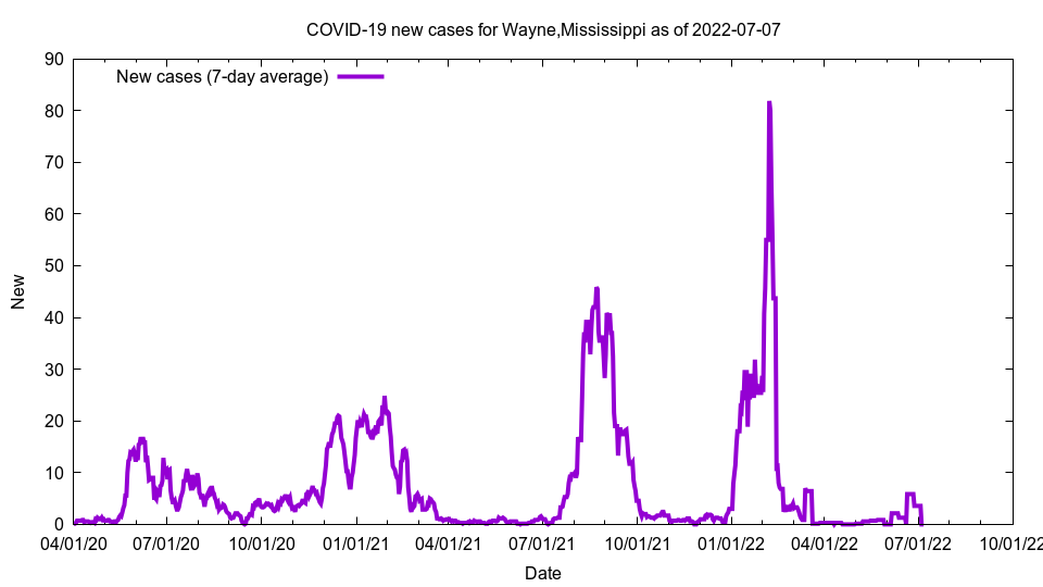 This image shows new cases for Wayne, Mississippi as of 2022-07-07